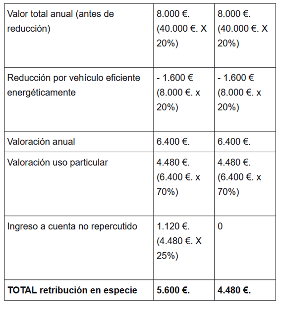 La retribución en especie está sometida a ingreso a cuenta, que es el resultado de aplicar el tipo de retención por IRPF correspondiente al salario del trabajador al valor del uso privado del vehículo. El importe del rendimiento íntegro de la retribución en especie está constituido por la suma del valor de la misma más el ingreso a cuenta que realizará la empresa, siempre y cuando no se haya repercutido al empleado. Ejemplo: Valor del vehículo híbrido: 40.000 €., con uso privado del 70%. Tipo de retención IRPF: 25%